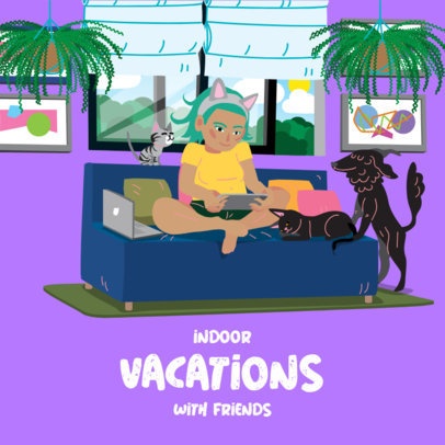 Illustrated Instagram Post Template Featuring a Man Having Fun with His Cats
