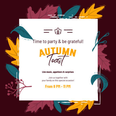Try any of these Instagram post design generators featuring modern online invitations for different Thanksgiving-themed events like concerts, galas, dinners, brunches, toasts, and more. They feature elegant layouts with illustrated fall leaves. Start now!