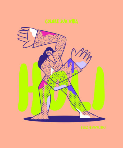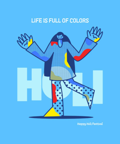 These cool designs feature colorful graphics and quotes for Holi Festival. There are illustrations of happy people covered in paint dancing, jumping, and walking.