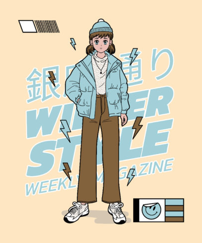 T-Shirt Design Template Featuring a Female Manga Female Character in Winter Clothes
