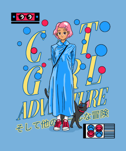 Animecore T-Shirt Design Template Featuring a Female Character and a Cat Illustration