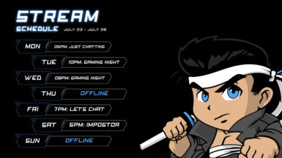 Check out any of these Twitch screen design generators featuring illustrated gaming characters and weekly streaming schedules. Try them now!