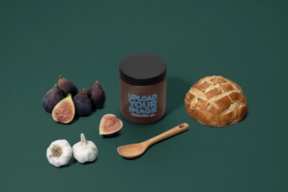 Mockup of an Amber Jar Placed by Garlic and a Loaf of Bread