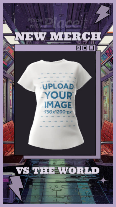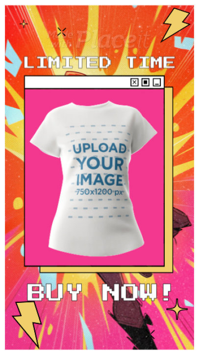 Check out this 9x16-sized video of a ghosted 3D t-shirt with a rounded neck. It floats against bright background colors. It also features animated text and graphics like bolts and stars. Start now!